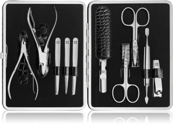 Elegants nagu kopšanas komplekts ar deviņiem instrumentiem melnā ādas futrālī. Ietver knaibles, šķērītes, pincetes, nagu vīli un citus profesionālus instrumentus pilnvērtīgam manikīram un pedikīram. Instrumenti izgatavoti no nerūsējošā tērauda, kas nodrošina precizitāti un ilgmūžību. Praktisks komplekts mājas lietošanai un ceļošanai. Izsmalcināts dizains padara to par lielisku dāvanu. Augstākās kvalitātes izvēle rūpīgai nagu kopšanai.